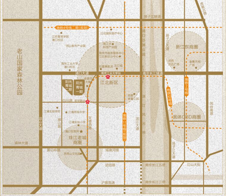 阳光青城二期作为阳光青城一期后续项目,其地理位置十分优越,江北新区核心区域,地铁10号线龙华路站、临近亚青广场市政公园、长江隧道出口处1000米微距离,以及位于浦口大道核心CBD的黄金中断位置,更能即刻拥有阳光青城一期大型商业体配套,让这里在享受出色环境的同时,更能享受现代生活的便捷与繁华。